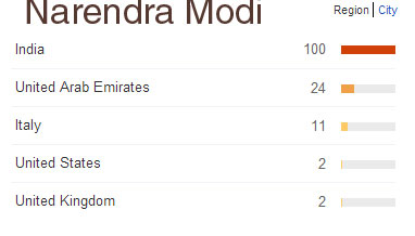 The search terms for Modi were Modi news, Modi rally, Modi speech. For Rahul, it is Rahul Gandhi interview, Arnab Rahul Gandhi and arnab, to name a few. Despite the Aam Admi Party being in the media glare for Somnath Bharti’s vigilantism, Vinod Kumar Binny’s revolt, and Kumar Vishwas ill-timed and inappropriate joke about Kerala nurses, Kejrwal’s name is not attached with any of these controversies in search queries. Not even ‘Kejriwal Anarchy’ is one of the most searched terms. Judging by the search terms used, Modi is clearly the most popular politician among Indians who rely on Google for news. People are closely following his election campaign.